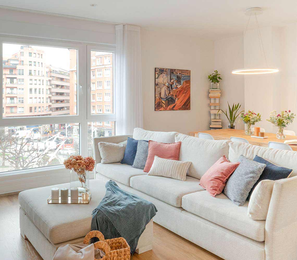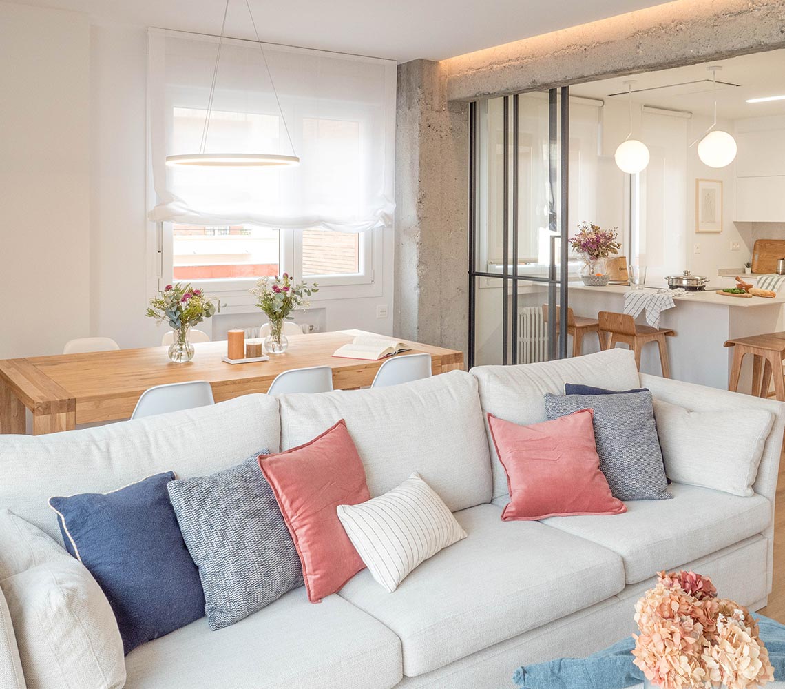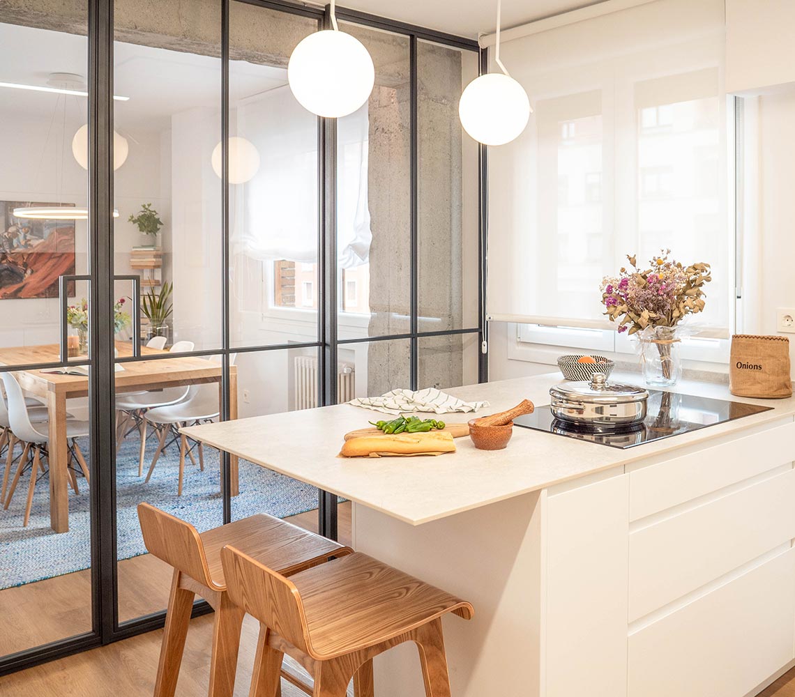 En este proyecto se llevó a cabo el diseño, la reforma integral y la decoración de la vivienda. Esta vivienda de 120 m2 ubicada en Bilbao necesitaba una redistribución de espacios para poder satisfacer las necesidades de sus propietarios, una joven familia con dos hijos pequeños. La prioridad fue diseñar una cocina amplia conectada al salón para poder aprovechar la luz del ventanal de este último. De esta manera, el salón quedó visualmente conectado con la cocina pero con la opción de separar ambos espacios mediante un cerramiento diseñado a medida en acero negro con puertas correderas.