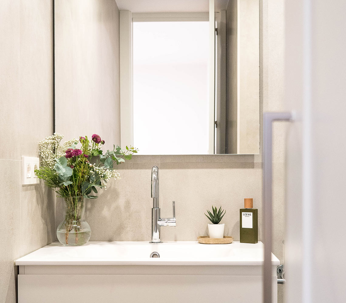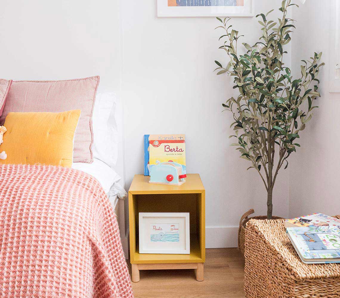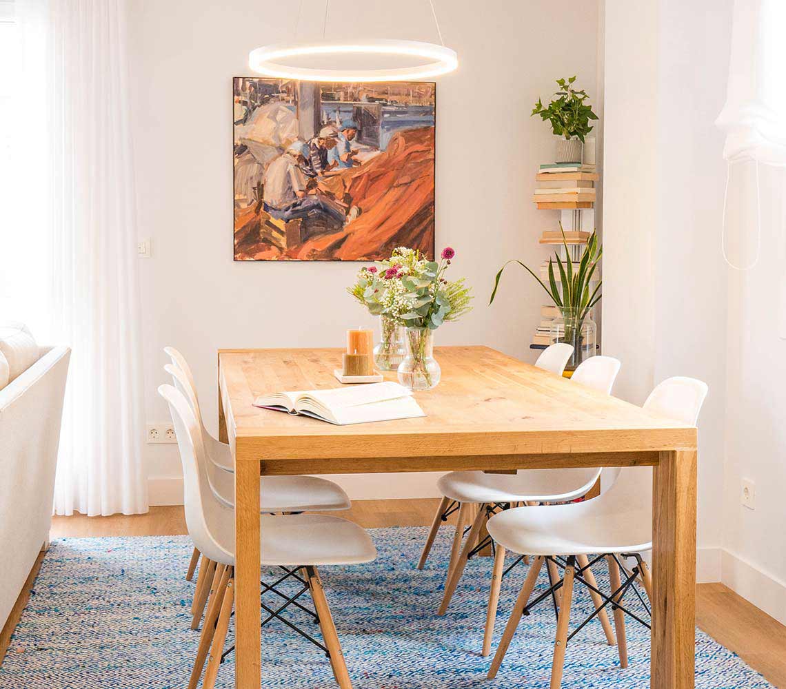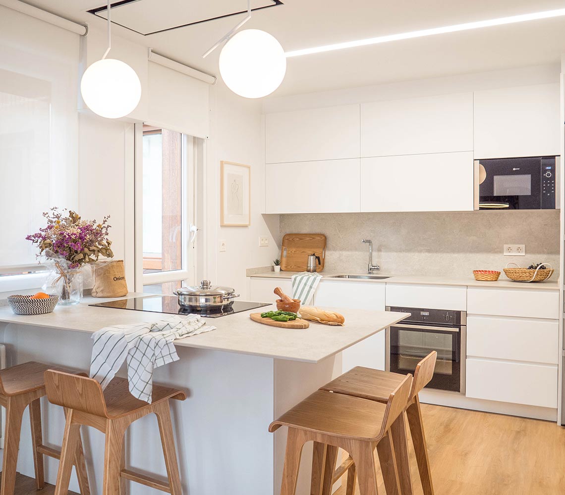 En este proyecto se llevó a cabo el diseño, la reforma integral y la decoración de la vivienda. Esta vivienda de 120 m2 ubicada en Bilbao necesitaba una redistribución de espacios para poder satisfacer las necesidades de sus propietarios, una joven familia con dos hijos pequeños. La prioridad fue diseñar una cocina amplia conectada al salón para poder aprovechar la luz del ventanal de este último. De esta manera, el salón quedó visualmente conectado con la cocina pero con la opción de separar ambos espacios mediante un cerramiento diseñado a medida en acero negro con puertas correderas.